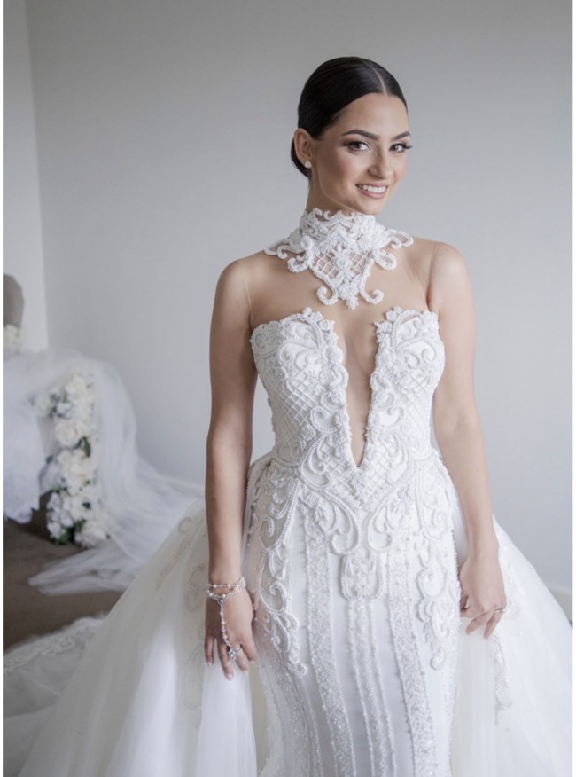 A custom made 2 piece dress made by one of the best! Hand beaded with an elegant neck piece and low bodice.