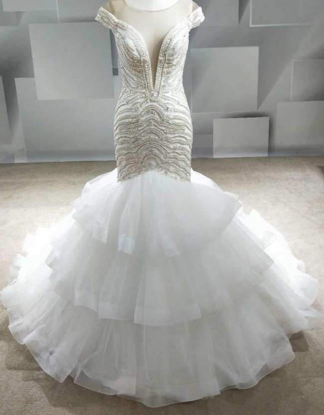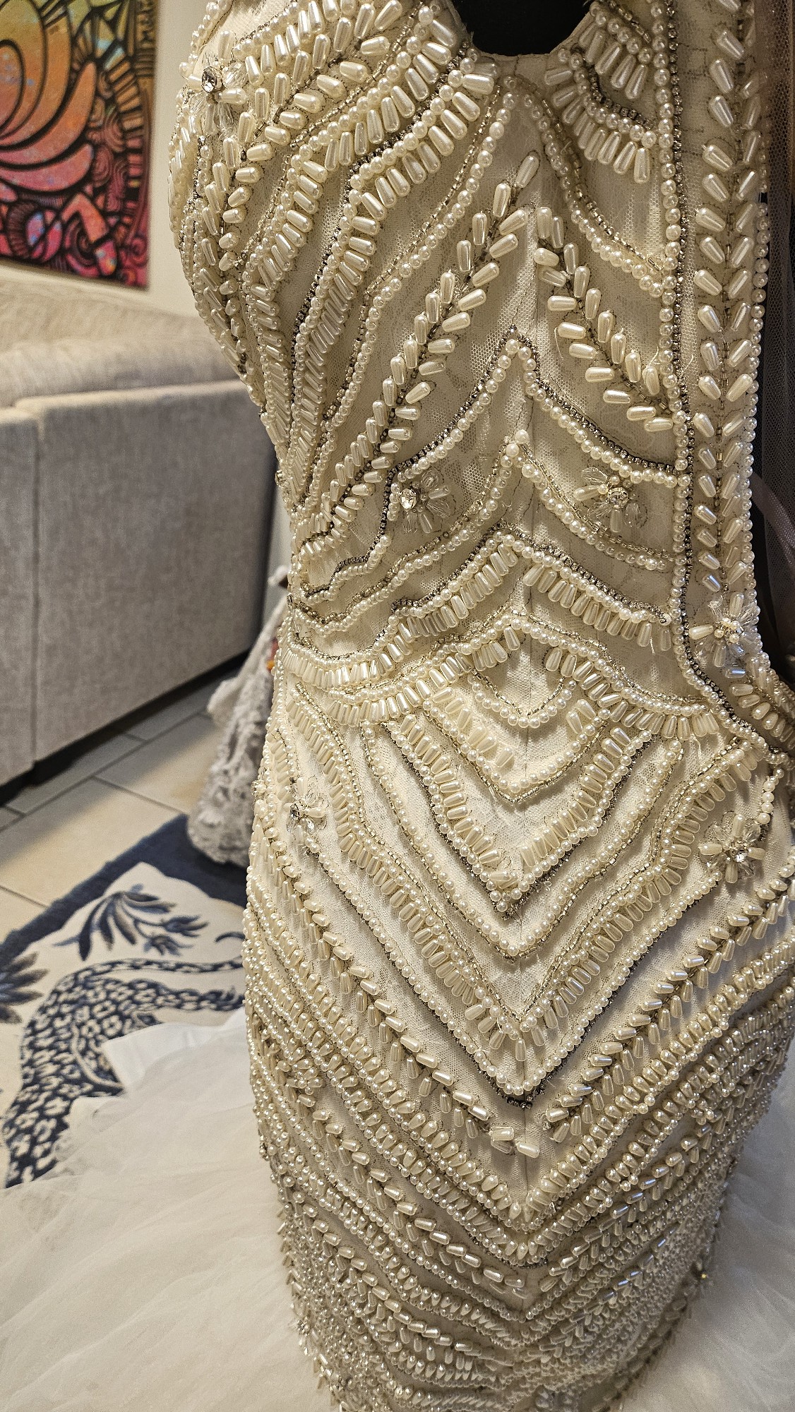 Entirely hand-beaded over the course of 6 months, this enchanting fit and flare wedding dress is a breathtaking celebration of elegance and romance. The exquisite off-the-shoulder neckline gracefully frames your collarbone, adding a touch of allure and sophistication to your bridal look. The design beautifully hugs the body, accentuating your curves before extending into a graceful flared silhouette that flows effortlessly with each step you take.