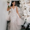 It has a low back and beautiful lace detailing on the straps. It has a loop for the train of the dress and the top skirt comes on and off really easily! The dress has a zipper and is very easy to take on and off.