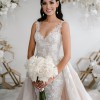 This includes a veil with soft lace, fitted dress with extensive lace detailing and overskirt also with lace detailing.