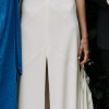 The V front neckline leads to narrow straps that extend down the back. Lightly fitted over the hip to the mid thigh with a beautiful flare at the hem and a centre front split from just above the knee.