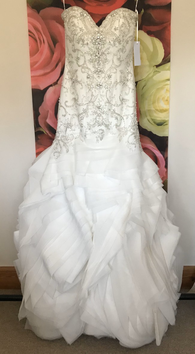 In Excellent clean condition with no imperfections or visible marks that I can honestly see. There are a few loose beads and some very slight 'dust' marks on the inside hem (not noticeable when wearing). This dress has been tried on in our bridal shop but never worn or altered.