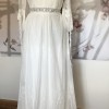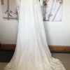 A soft romantic boho inspired gown. The soft lace skirt, fitted at the natural waist with a lace sash, is paired with an original, bohemian-style fitted bodice with a sweetheart neckline and a lace overlay with a deep scoop back. The 3/4 lace sleeves are edged with a ruffle. This simply stunning dress is perfect for destination or a vintage style wedding.