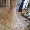 Dramatic lace appliqué fall over this slim flared skirt, with delicate beading and Chantilly lace, this dress captures the essence of both romantic and dramatic.