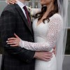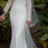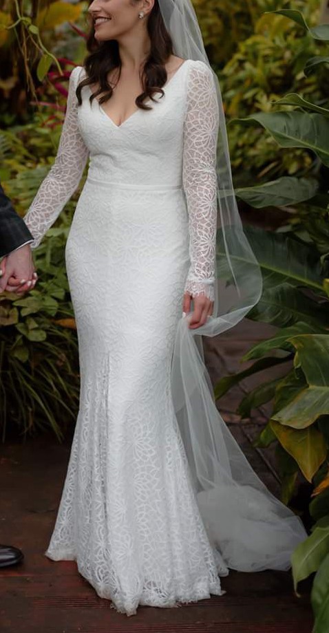 Karen Willis Holme's Rylie gown features a flattering V-neckline and fitted shape with modern floral inspired lace. The skirt is figure hugging and has a centre back godet with a statement train. The gown has beautiful sleeves added to it. The dress comes with a fine belt featuring a gold clasp closure that you can wear at the front or back. It is stretch lace and ivory colour.