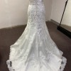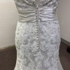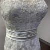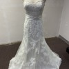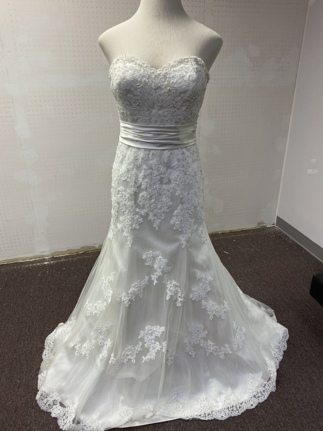 A slim fit and flare gown in beaded lace. Tulle accented with a regal satin cummerbund and buttons covering the back zipper. The color is alabaster. Sample dress has been tried on, but never worn or altered. The band around your waist really helps to make you feel thin and give you more of a waist!