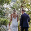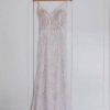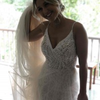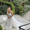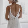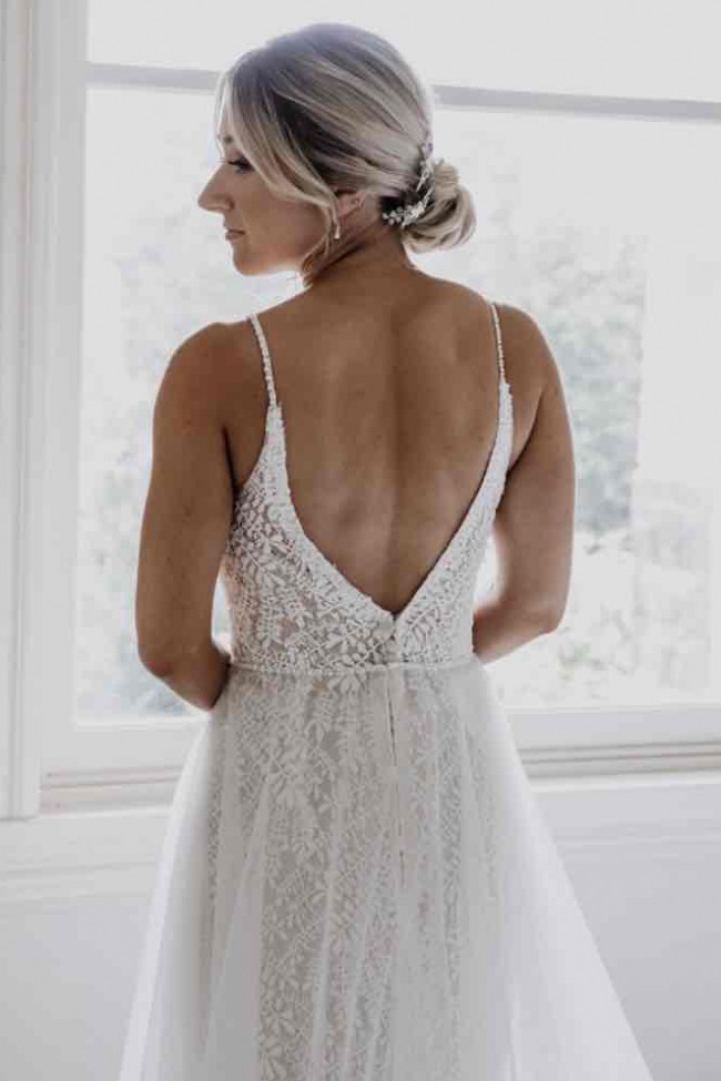 A stunning open lace fit and flare wedding dress with delicate straps, a subtle V-neckline and plunging V-shaped back.