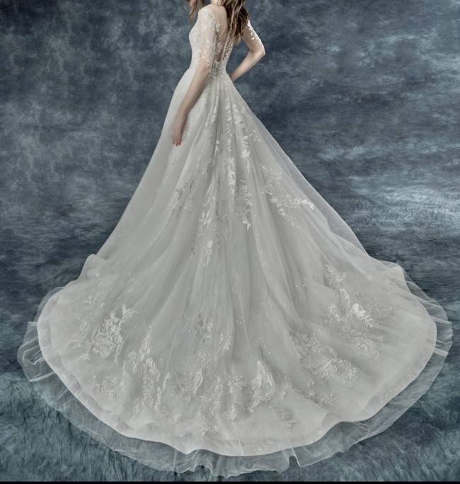 Beautiful brand new wedding dress with fluffy skirt! Including under puffy skirt, beautiful long veil, extra buttons & extra lace! I didn’t wear because of pandemic cancelled the ceremony! Never altered or wear! It’s gorgeous and well made.