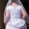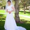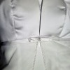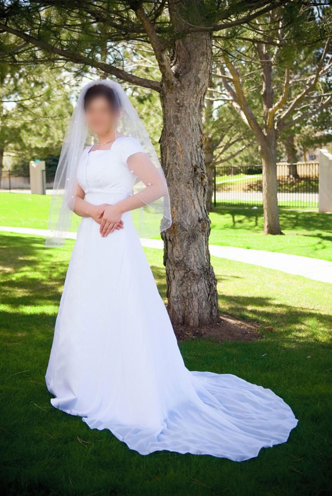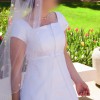 This is a stunning and timeless dress that features an elegant empire waist and a beautiful chiffon overlay. The dress is adorned with intricate beadwork on the edging of the chiffon and the bust, which adds a touch of glamour to its overall look. It also comes with capped sleeves and a simple zipper at the back for easy wearing. You'll find it extremely comfortable to wear during dancing, photos, and all your wedding celebrations. The dress has been professionally dry cleaned and stored, and includes a simple short bustle. To complete your bridal look, a veil is also included.