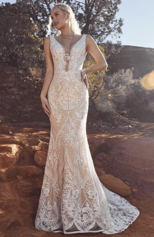 Beautiful bohemian inspired wedding gown. Brand new, never even tried it on after it came in. Pictures are from sample dress in store.