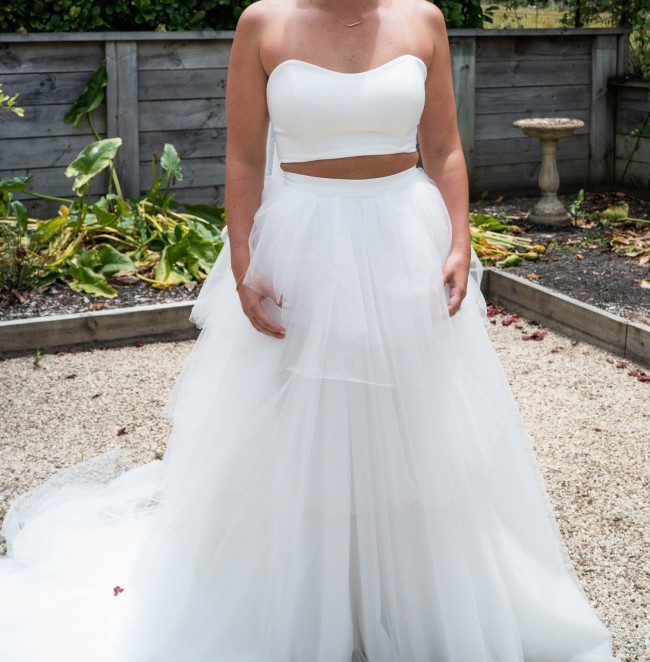 Skirt and top separate design with a small gap just above the waistline - this gown is a great style for a modern take on a classic a-line wedding dress.