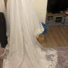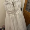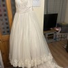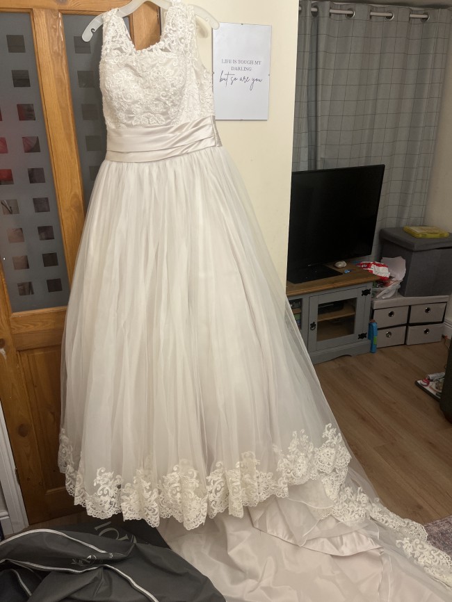Stunning gown, ivory colour, it has a lace with sequins application then a satin waste band with a silk ball gown with chiffon hem detail and train.