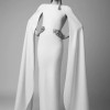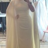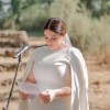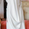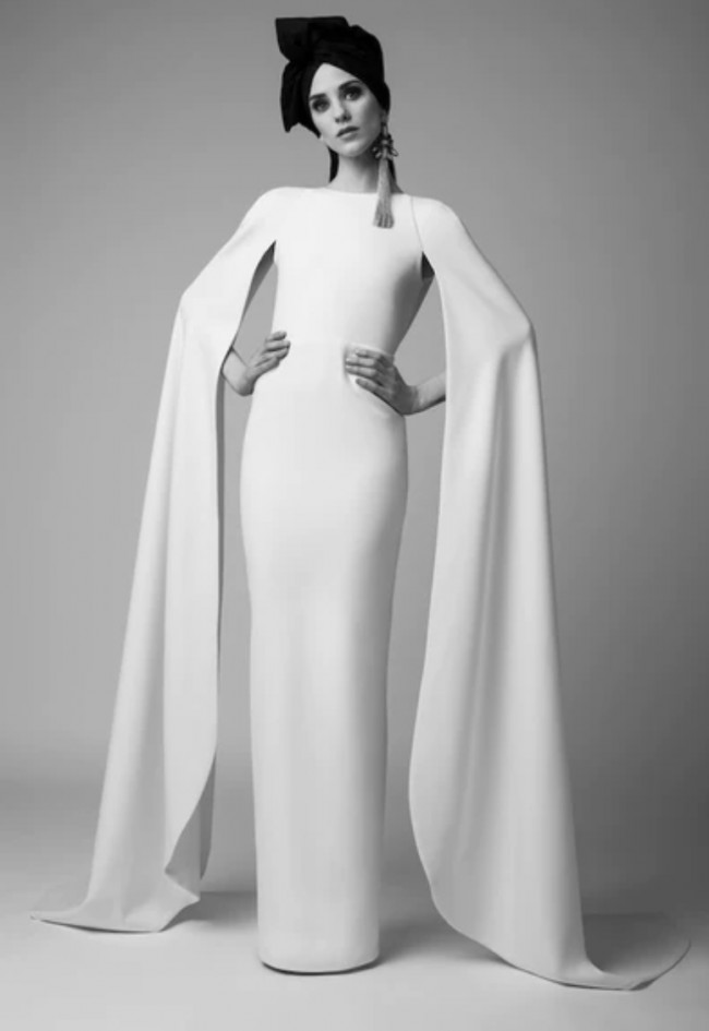 Beautiful, unique, minimalist and modern wedding dress with cape-like sleeves. Handmade in Spain. Couture and elevated. I am between a size 14 and 16 with an apple shape body and I thought it looked amazing on me. I am 5'4" for reference.
