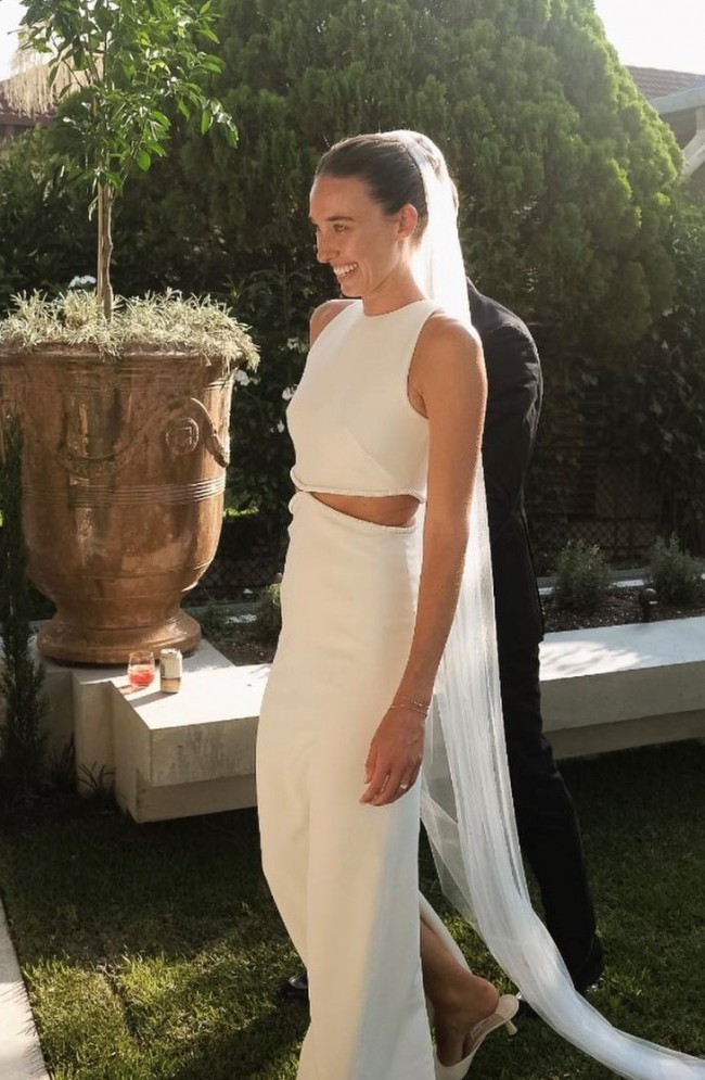 The Glenda dress is the perfect balance between sultry and understated. Made of stretch crepe, this 90s inspired slimline silhouette features a waist cut out detail trimmed with crystal rhinestone details. Perfect for brides who want to feel chic, modern and elegant.