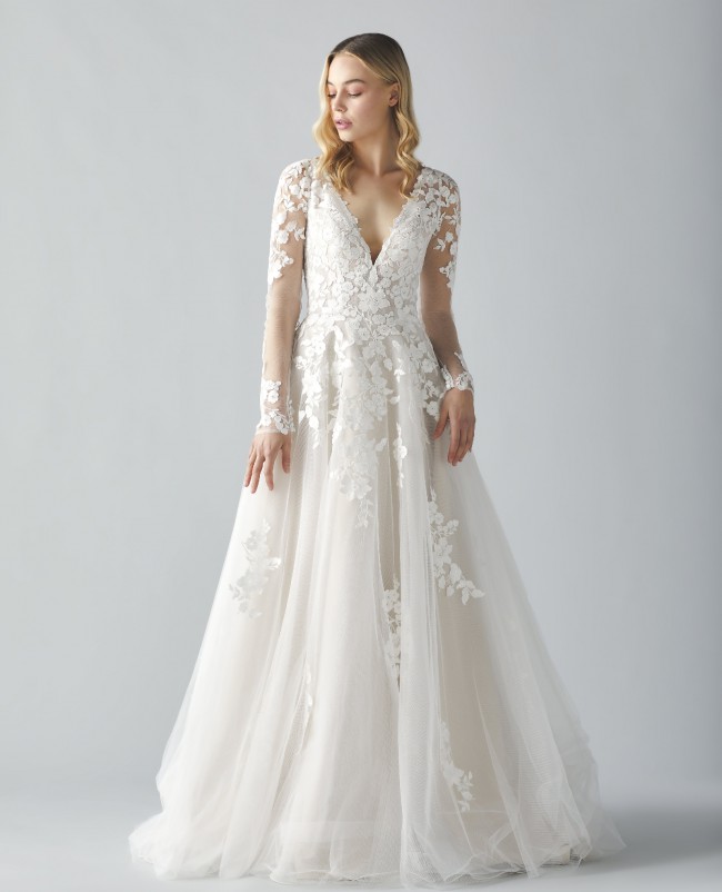 Ti Adora by Allison Webb bridal gown - A long sleeve, v-neck, tulle ballgown with lightly sequined floral lace appliqués throughout the bodice, cascading past the natural waist and hand placed on the sheer sleeves and skirt. The sweetheart lined bodice and sleeves both have a modern clean finish.