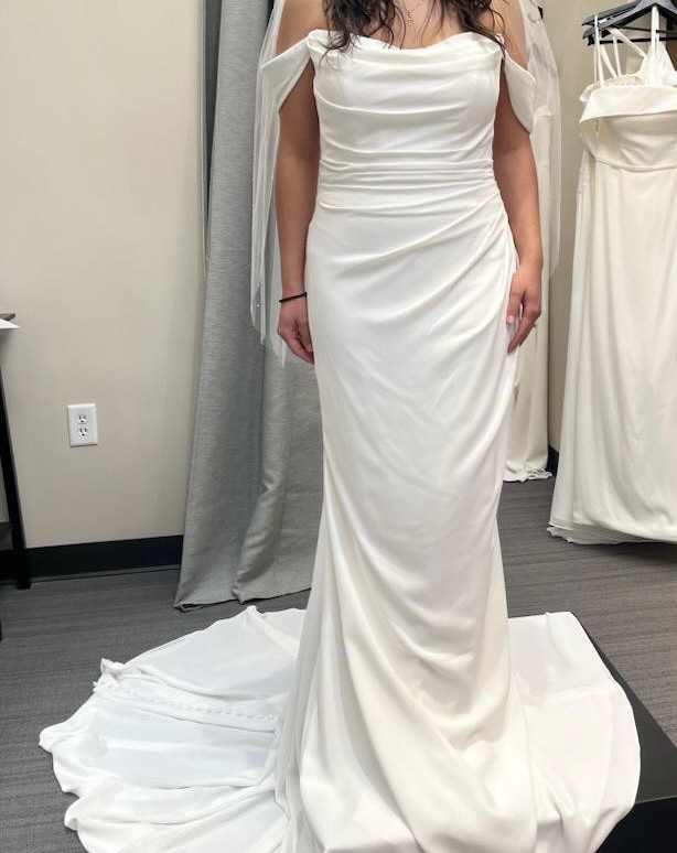Beautiful dress that gives a flowy elegant look with gorgeous buttons that run down the back. Has off the shoulder straps that are detachable. Has built in corset and built in bra. This dress is BRAND NEW off the rack with no alterations made and with the tags still on. Purchased in late 2023.