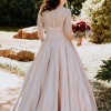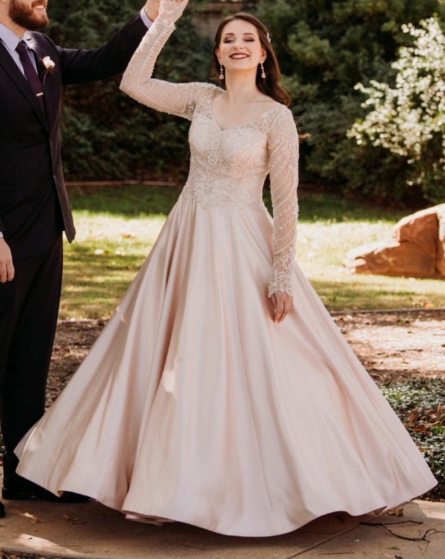 The dress features delicate sheer sleeves that add a touch of romance to your bridal look. The beaded sequins scattered across the bodice sparkle and shimmer, ensuring you'll be the center of attention on your special day.