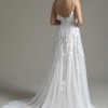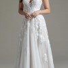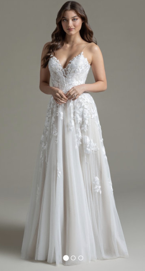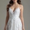 Ti Adora by Allison Webb bridal gown - Ivory/Cashmere lace and English Net A-line gown. Natural waist sweetheart bodice with spaghetti straps and illusion trim, low scoop back, and cascading lace appliques over a layer of point d’esprit.
