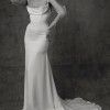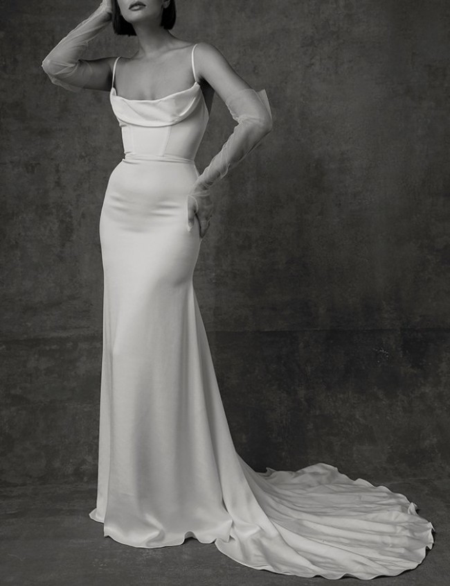 The Sarah Seven Rhea gown is a satin-crepe fit and flare gown with a luxurious sheen, structured bodice, spaghetti straps, and draped cowl neckline. I believe it is now discontinued which makes no sense since it is the perfect structured slip dress! There’s boning in the bodice that snatches your waist and it’s fitted around the hips with a 2 foot long train. So effortless and timeless, truly obsessed with this style. Designed and made in NYC so well made. You will look fabulous in her 💗