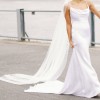 I wore the dress from ceremony to reception before switching into another dress. Dress has been dry cleaned and has one small mark on the back by the bustle button. There are also a few loose threads near the button. Both flaws are shown in photos 3 (far away) and 4 (close up) of dress.