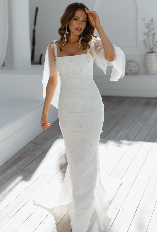 Intricately hand beaded and elegantly sculpted to the female form, the Tahlia Fitted is the epitome of sophistication and style. Featuring a modern square neckline and stunning hand-crafted 3D floral embellishment, the Tahlia is a feminine and elegant statement in crisp ivory.