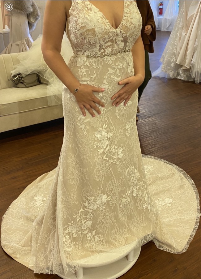 This gown has never been worn. It has already been hand altered by a very talented seamstress and will be a great fit for a bride that has a sculpted waist, large busts, and beautiful curves… this gown romantically hugs your curves and makes you feel sexy and beautiful.