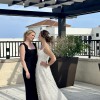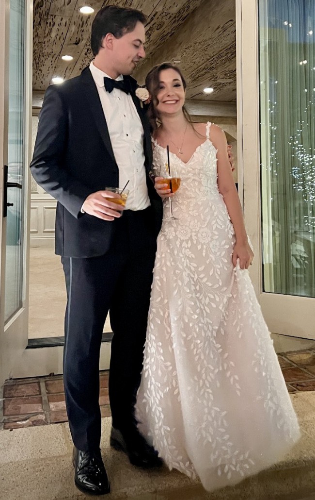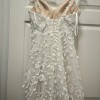 Worn for March 2024 wedding. Floor length gown with thin straps made from 3D appliqué. Outer fabric is ivory and lining is nude with white lining between nude layer and outer layer. Outer fabric is a shimmering toole-like material with 3D appliqué. No alterations to bottom aside from shortening (5’4” and wore 2.75” heels) and adding bustle. Top was taken in - typically a XS/S in tops and wear a 32B.
