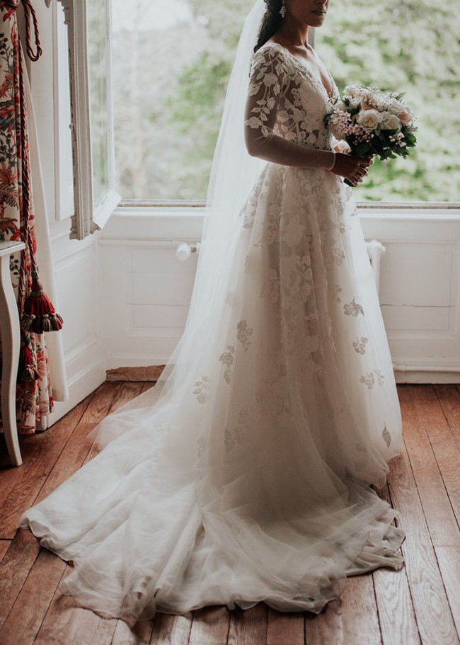 Whether you're planning a grand ballroom affair or a romantic garden wedding, the Illusion Sleeve Plunging Ball Gown Wedding Dress is the perfect choice for the bride who wants to make a statement. With its timeless design and impeccable craftsmanship, this gown is sure to leave a lasting impression on all who lay eyes on it."