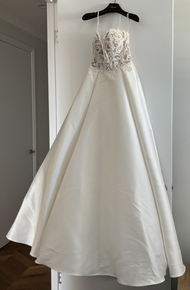 Brand new ivory wedding dress that has not been altered. Tags including original price is all still attached to the dress.