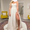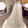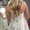 This is a beautiful dress that has never been worn. It has classic style and a chapel lenth train. The waistline is at the natural waist, and the fabric is Mikado. There is no lace, it features pockets and a thigh front slit. There are no blemishes or damage, as it has not been worn. We have the original receipt and are the original owners. The measurements are from the Stella York size chart found online.