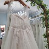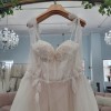 Top is a heart shaped lingerie corset with some beaded details of flowers and leaves, and straps with small tulle bows. Bottom is a skirt made of mesh tulle. Color is ivory with a subtle champagne undertone.