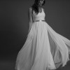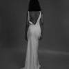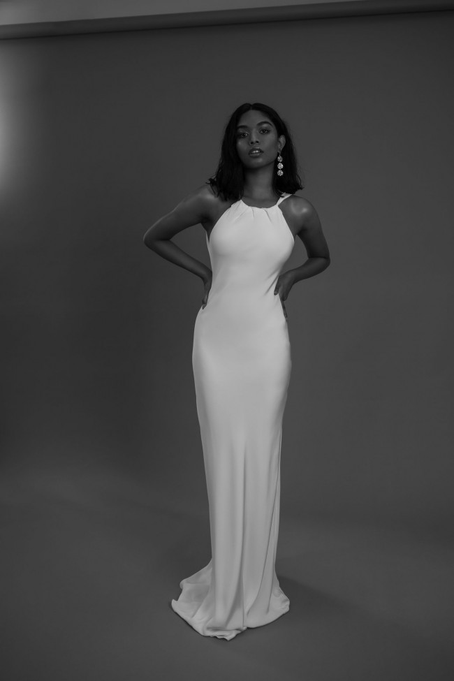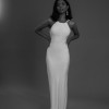 Bias cut dress in silk crepe with gathered halterneck, twisted straps and low back. With train.