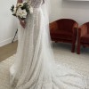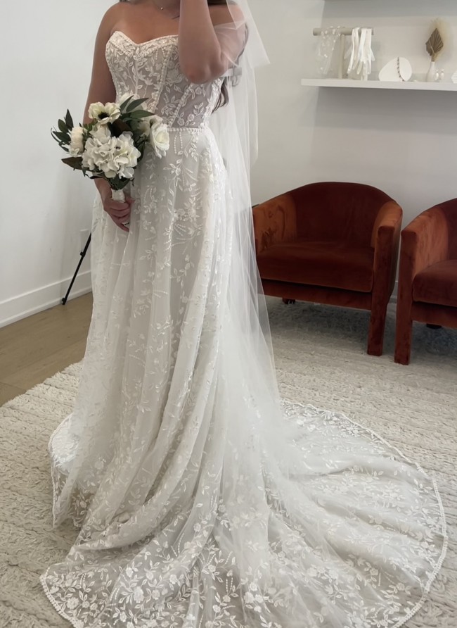 Bought this dress for 3250 with shipping and tax included. Has never been worn and never taken out of dress bag but it has been checked for rips and damages. Bought this dress thinking I would be giving birth a few months before the wedding but we ended up pushing it back so now this dress is just way too big for me. No alterations have been made.