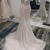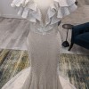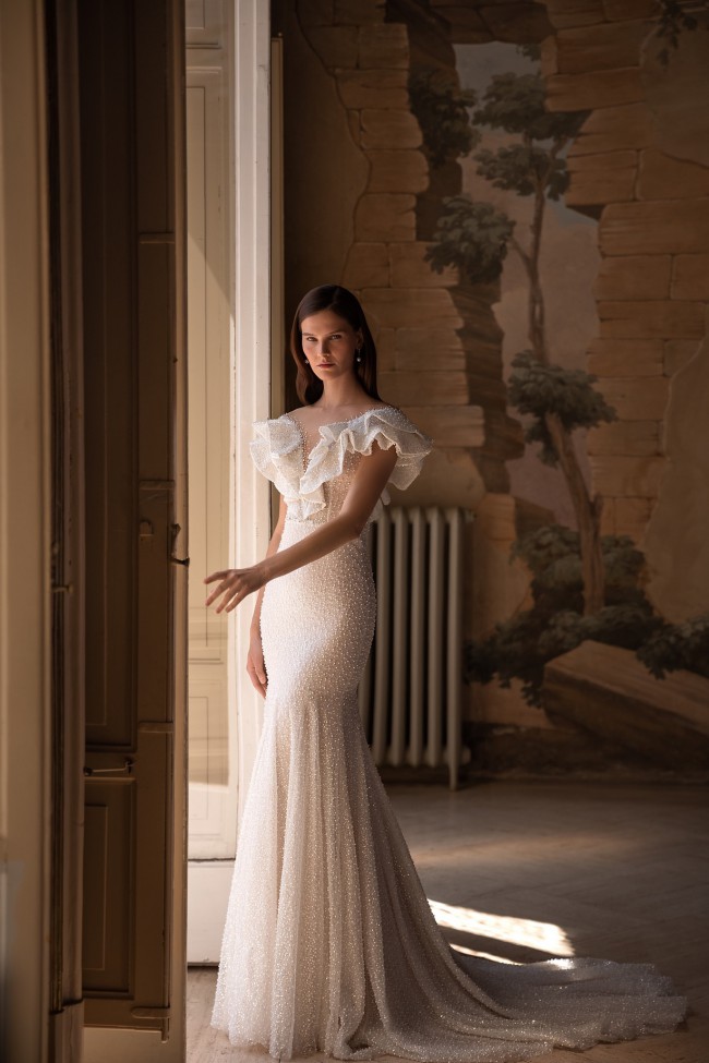 Ezra by Wona Concept is an exquisite beaded fit to flared wedding dress featuring an illusion off the shoulder neckline with a beaded ruffle sleeve. There is a tear in the mesh at the back clasp, that can be mended with a seamstress in alterations. This stunning wedding gown is a sample and has no alterations. Make this bridal gown part of your special day to day!