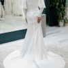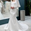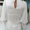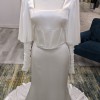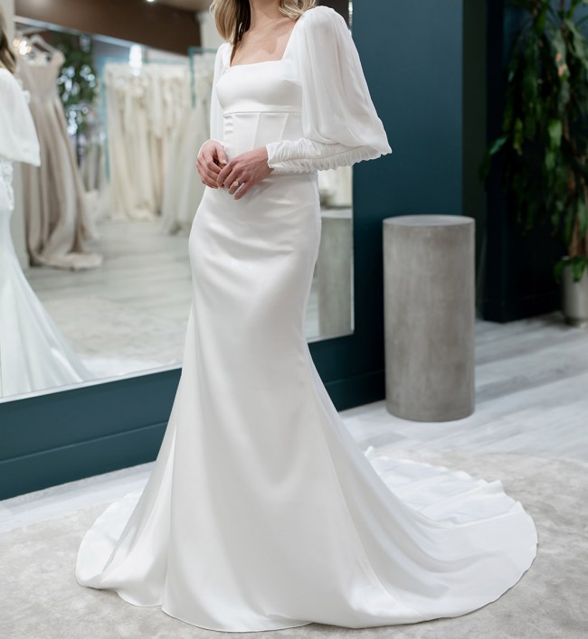 Laurel is an exclusive one of a kind demure wedding dress! This exquisite gown features a square neckline exposed boning, and chiffon bishop sleeve with textured cuff. This is a sample gown, and has no alterations and is in excellent condition. Make a statement in this gorgeous wedding gown today!