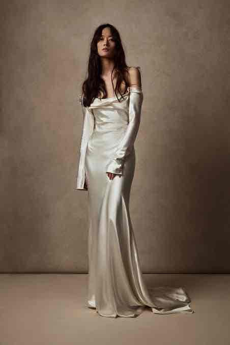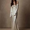 Wilted, long sleeve off the shoulder bias cut silk wool gown with criss-cross draping detail across low back. Darts at bust for shaping and 5 inch slit opening at inner wrist. Boned internal bustier with grosgrain, three closure position belt, wireless cups, and center back external zip. Fully lined skirt. Dry cleaned. No discolouration. Some small pulls due to the nature of the fabrication. Message for more photos.