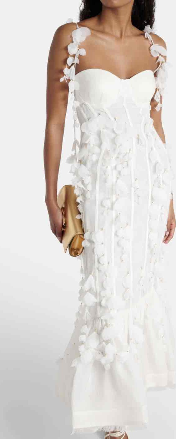 Zimmermann's ivory Botanica dress encapsulates the ethereal mood of the Wild Botanica collection, which draws inspiration from paintings depicted in The Flower Hunter a book by Australian artist and explorer Ellis Rowan. It's crafted from fine linen-blend organza with a boned bodice and sweetheart neckline framed by slender straps and whisper-weight laser-cut organza petals. Spotlight the gathered hemline with elegant sandals. PRODUCT DETAILS - Mid-weight linen-blend organza - Underwired cups, boned bodice - 3D laser-cut petal trims - Rouleaux straps - Elasticated back strap, hook-and-eye clasp - Gathered hem panel - White cotton lining - Back zip - Fits true to size - Slim fitting through the bust and waist, cut close over the hips and thigh - Elasticated back band for a more flexible fitting COMPOSITION - Main: 55% linen, 45% silk - Contrast: 100% linen - Trim 1: 100% polyester - Trim 2: 100% silk - Lining: 100% cotton - Exclusive of trims