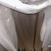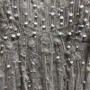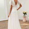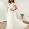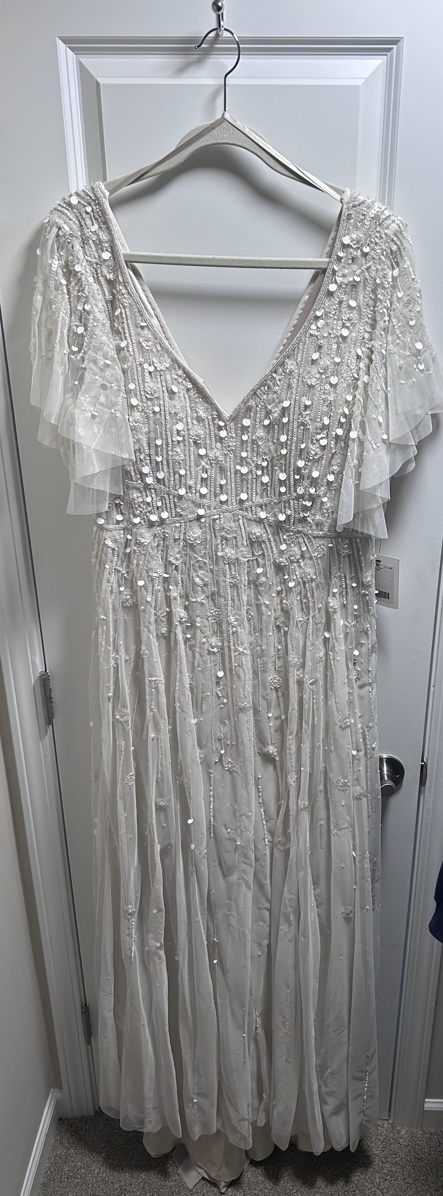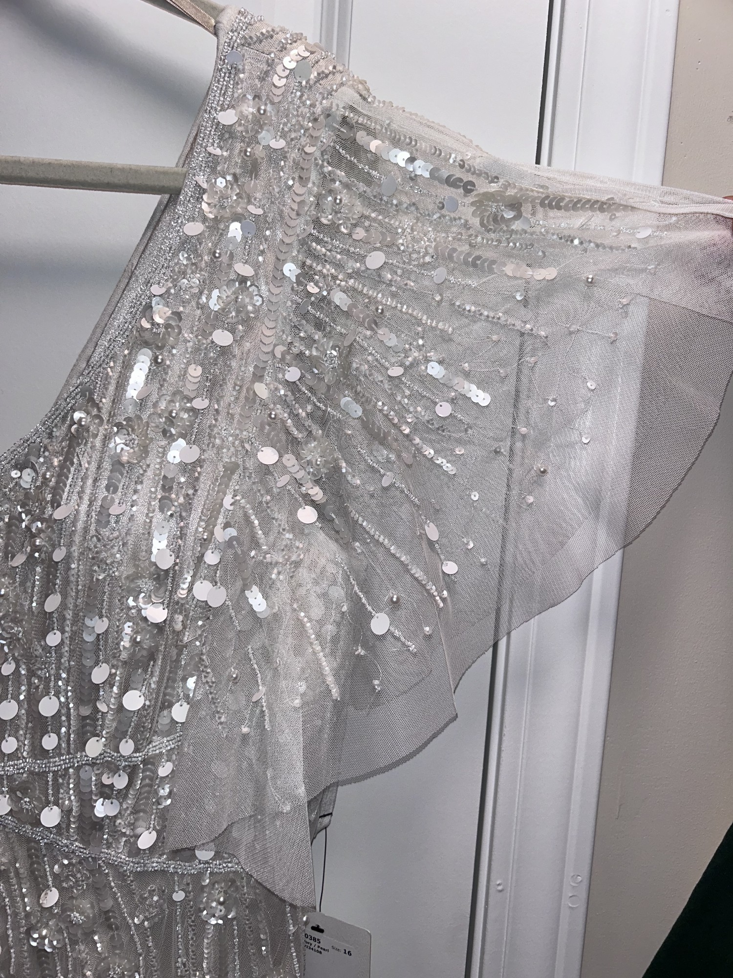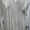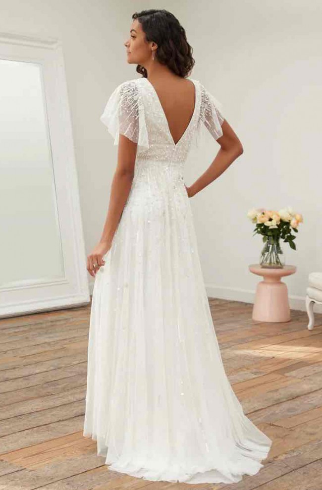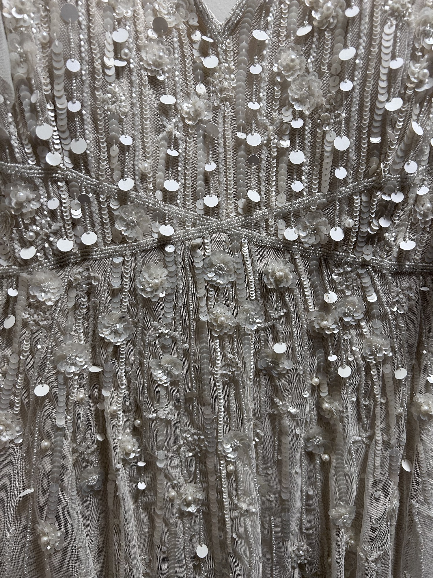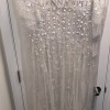 Discontinued dress!! Stunning ivory/pearl dress, hand beaded linear and floral beadwork encrusts this soft mesh bridal gown, finished with a crisscross waistband and a sweep train. A-line silhouette with a v-neck, low b-back, and shear flutter sleeves.