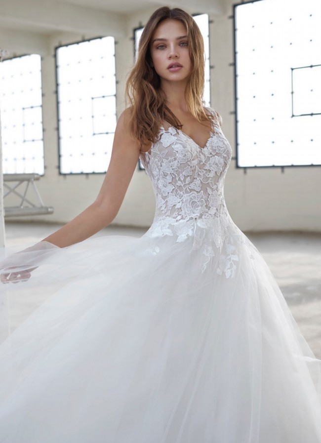 The Edythe Gown by Modeca, size 6, features a voluminous tulle skirt and a lace bodice with a v-neckline and v-shaped back, providing a lightweight yet dramatic silhouette.