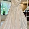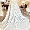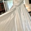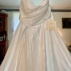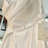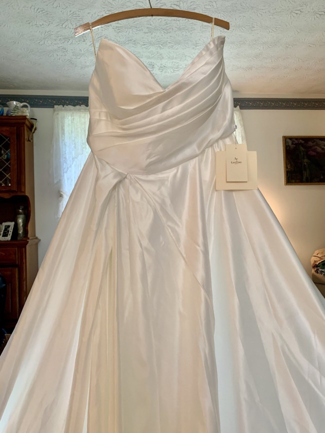 This simple classy little number is a sensational pick for anyone who loves a minimalist modern vintage look! Never been worn, and no alterations, and has front right slit design!! This dress would be extremely easy to make into a corset back with the right seamstress, giving it a great option and easy modification to fit a bride even better! You could even add a colorful sash or ribbon around the waist if you would like a little color- or even a bow in the back would look, fancy and classy at the same time!