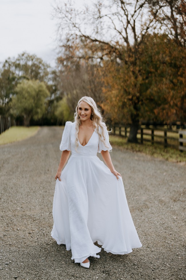Signature puff sleeves, a deep V neckline, a stunning open back, and a voluminous ball gown skirt with pockets, this beautiful gown will have you feeling like a modern day Princess Di.