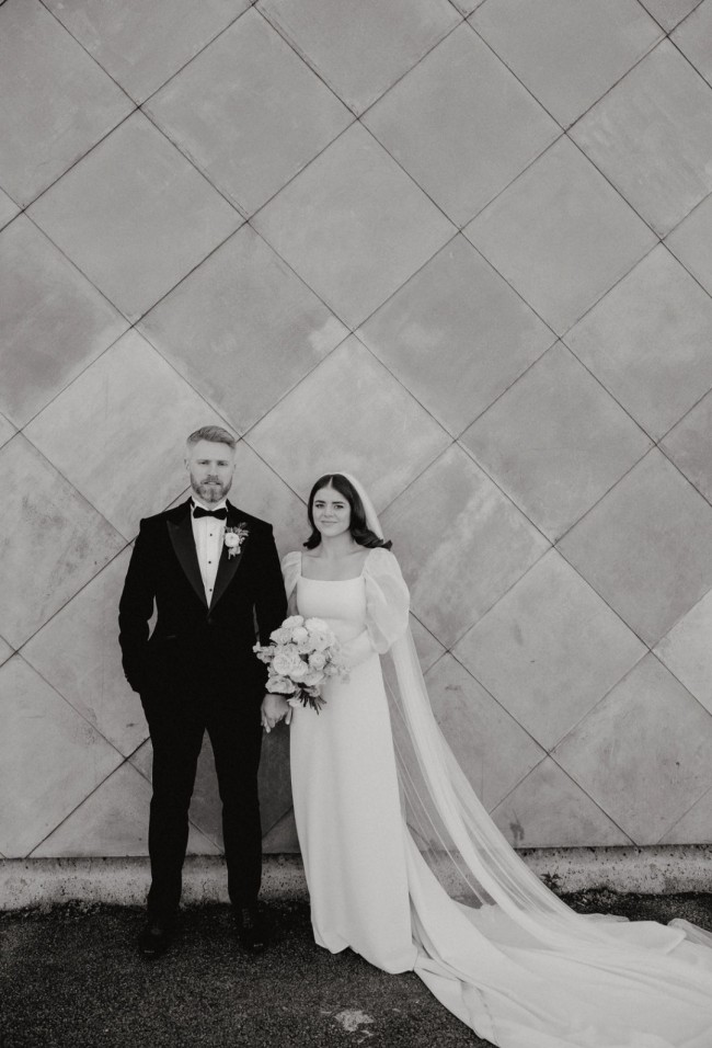 It's crafted of cathedral length crepe, pure silk puff sleeves and button cuff detailing. I paid for concealed bustles to be added which can fit to wrist or underneath the train for dancing or walking. I changed after dinner so I didn't wear this dress for the disco.