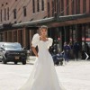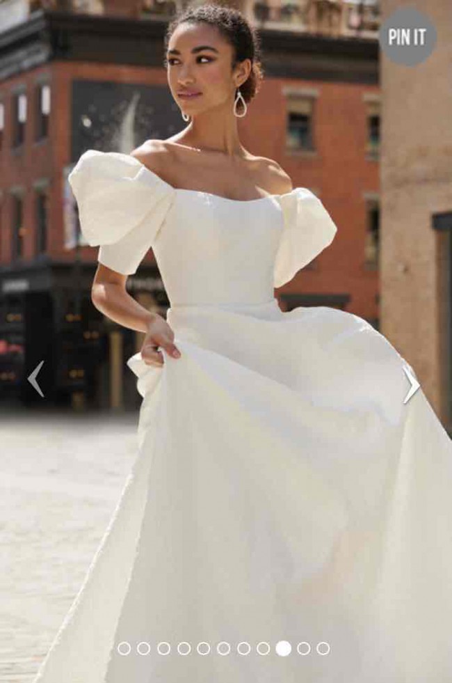Ti Adora bridal gown - Dramatic butterfly sleeve worn on or off the shoulder on a structured modified sweetheart bodice. Embossed floral sateen fabrication in a full A-line shape and wide chapel length train. -Never altered/never worn. Just found a different dress that worked better for me. -happy to provide any additional photos. Still in garment bag 😊