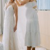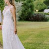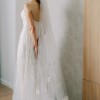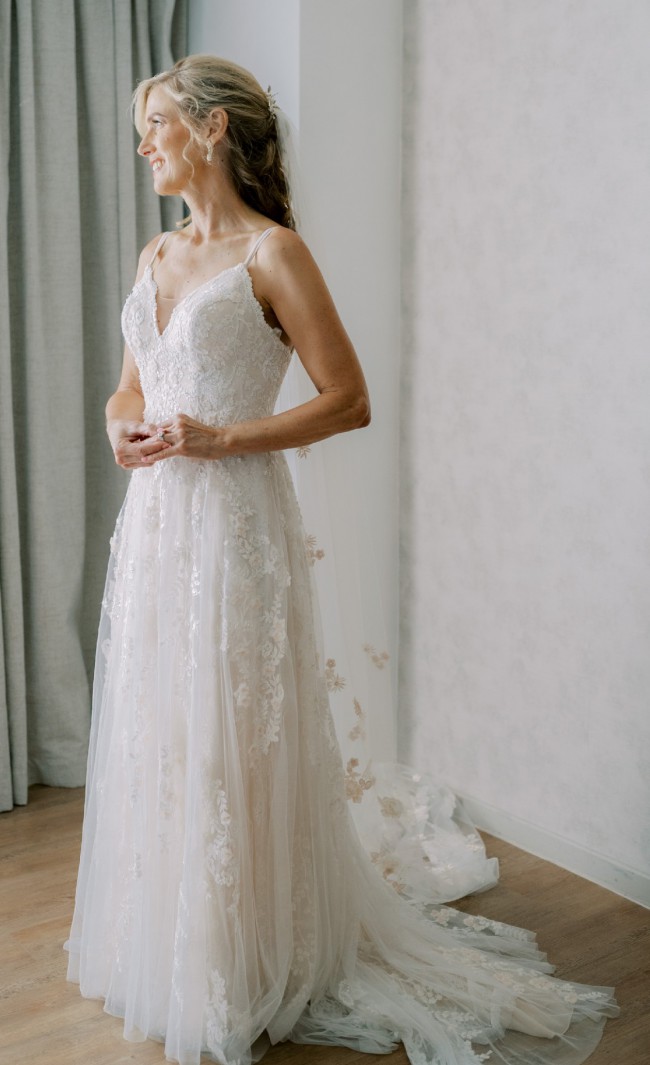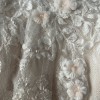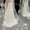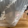 Gorgeous gown that is surprisingly light and comfortable despite 3 layers (2 with embroidery) that give it pattern depth. Outer layer is white lace with very light pink flowers, inner layer is ivory/light beige, giving the dress a softer character than bright white, but appears white in pictures and from a distance. I was not planning on a veil, but it is stunning, and as soon as they put it on me, I knew I must have it. The veil is full length with similar embroidery flowers and pearls. The dress has a tasteful train that is not cathedral length. I already had nice cloth loops and pearls added for the bustle, so that will not be an added expense for the buyer. Price includes the veil and a full-length garment bag with 4 pockets for shoes and accessories.