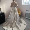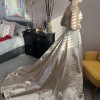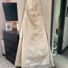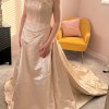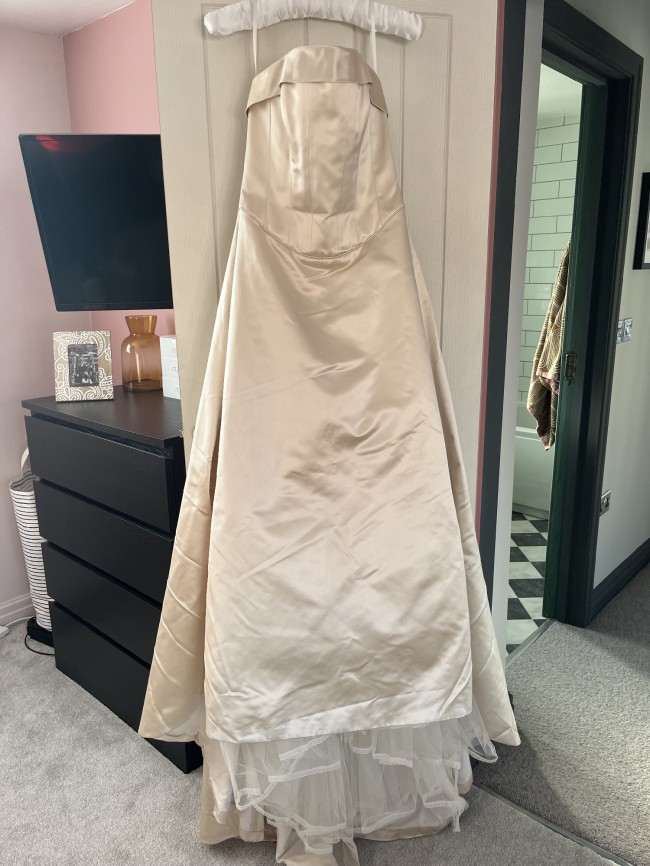 This wedding dress was made to measure by Sassi Holford, Style Gabrielle, Size 13, colour is Cappuccino in Silk Duchesse Satin. Worn once at my Christmas Wedding in 2001 and was then dry cleaned and the stored away. It was a magical dress which had a gorgeous warm shimmer for Christmas. Includes the Joyce Jackson 171D irrid Cream 108 inches cost £115. I bought the dress from Dreamcatcher Designer Wedding Dress Shop in Kirkham, nr Preston. My niece is wearing the dress in the photos! She is a bit shorter than me. The dress is still in perfect condition and would make a real statement for any wedding!
