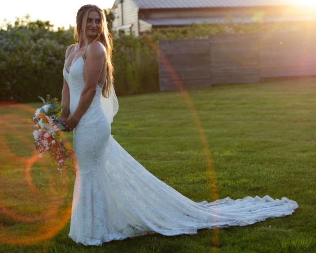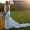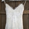 Indulge in the romantic embrace of Clo. Elegant rose stretch lace. Mermaid style with a fit and flare silhouette. Medium length train. Spaghetti Straps with a sweetheart top adorned in lace. Worn only once and professionally cleaned. Stretchy fabric with no zippers or buttons, it simply pulls on. Will fit sizes 0-6 easily. This dress is so special and truly made me feel beautiful on the most important day. I was very comfortable. The fabric was not heavy and was breathable. Highly recommend this brand.