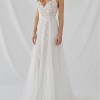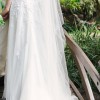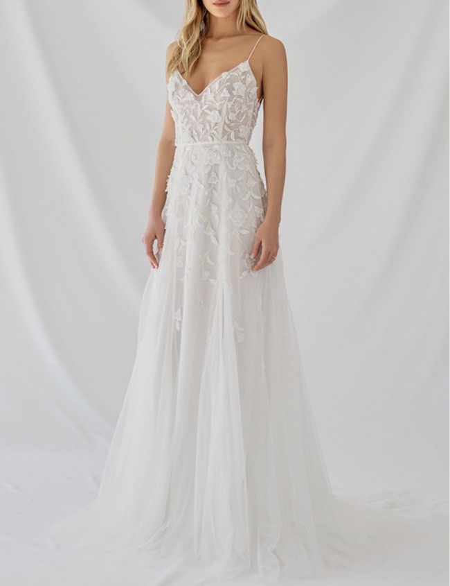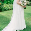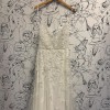 A-line gown with beaded hand-embroidered floral appliqué, low scoop back, and skirt slit. It was made to order so it’s been wore only once. Had alternation and added light boning around the bust/ waist (trust me, it's worth it). Bustle added to the back. Dry cleaned and in excellent condition!