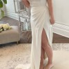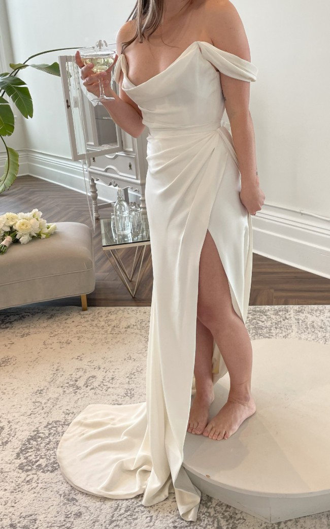 Adele has a fitted bodice, low back, high leg slit, and cap sleeves that can be worn up or down.
