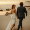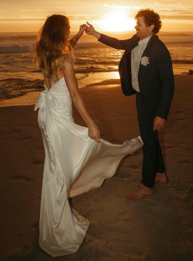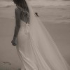 Minimalist silk-satin wedding dress with a gorgeous low-cut back. The train is detachable which is ideal for dancing and during the reception.