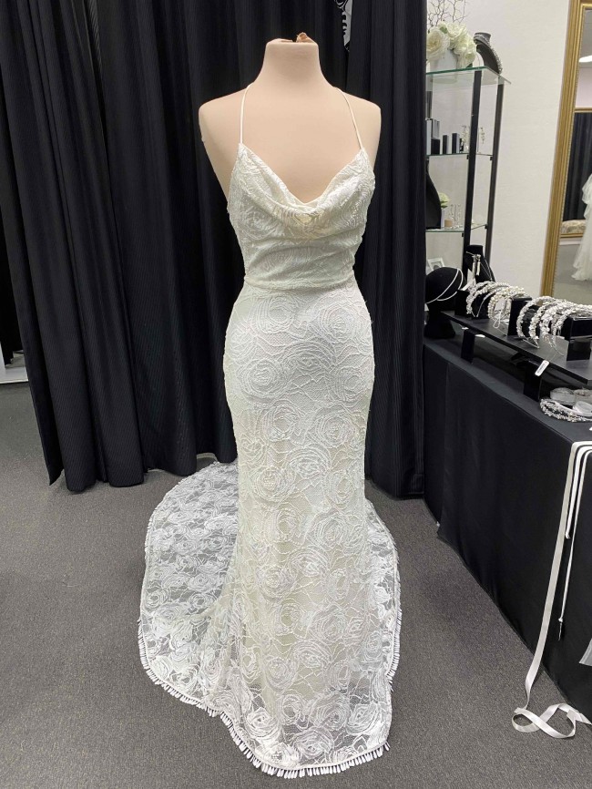 I didn’t end up wearing this dress, I bought two dresses and went with the other one :) Designer Description: “Comfortable, luxurious, and instantly flattering on all body shapes, the Honey Rose highlights your best assets and makes you feel flawless. Handmade in our original rose lace designed in-house, which supports the body and shimmers in the sunlight with its pearlescent thread. You’ll love the fine lace-up silk rouleau straps finished with freshwater pearls, the soft cowl neck, the A-line skirt which draws you in at the waist, and the elegant train with a built-in wristlet in a stunning raindrop trim. The Honey Rose is the dress you’ve been waiting for!” - Grace Loves Lace